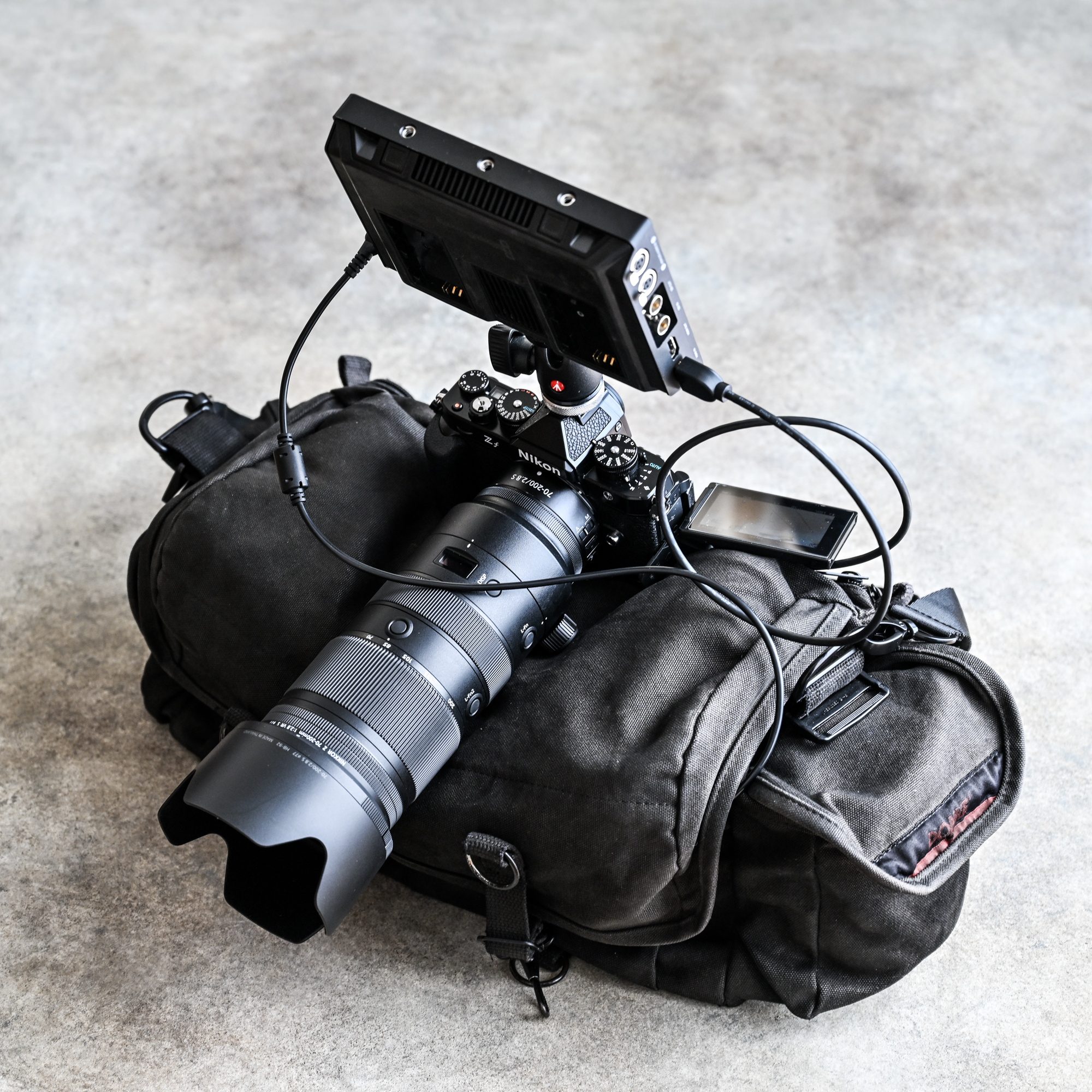 今回は外部モニターに電源を供給するためにVマウントバッテリーだけをバッグの中に入れています。