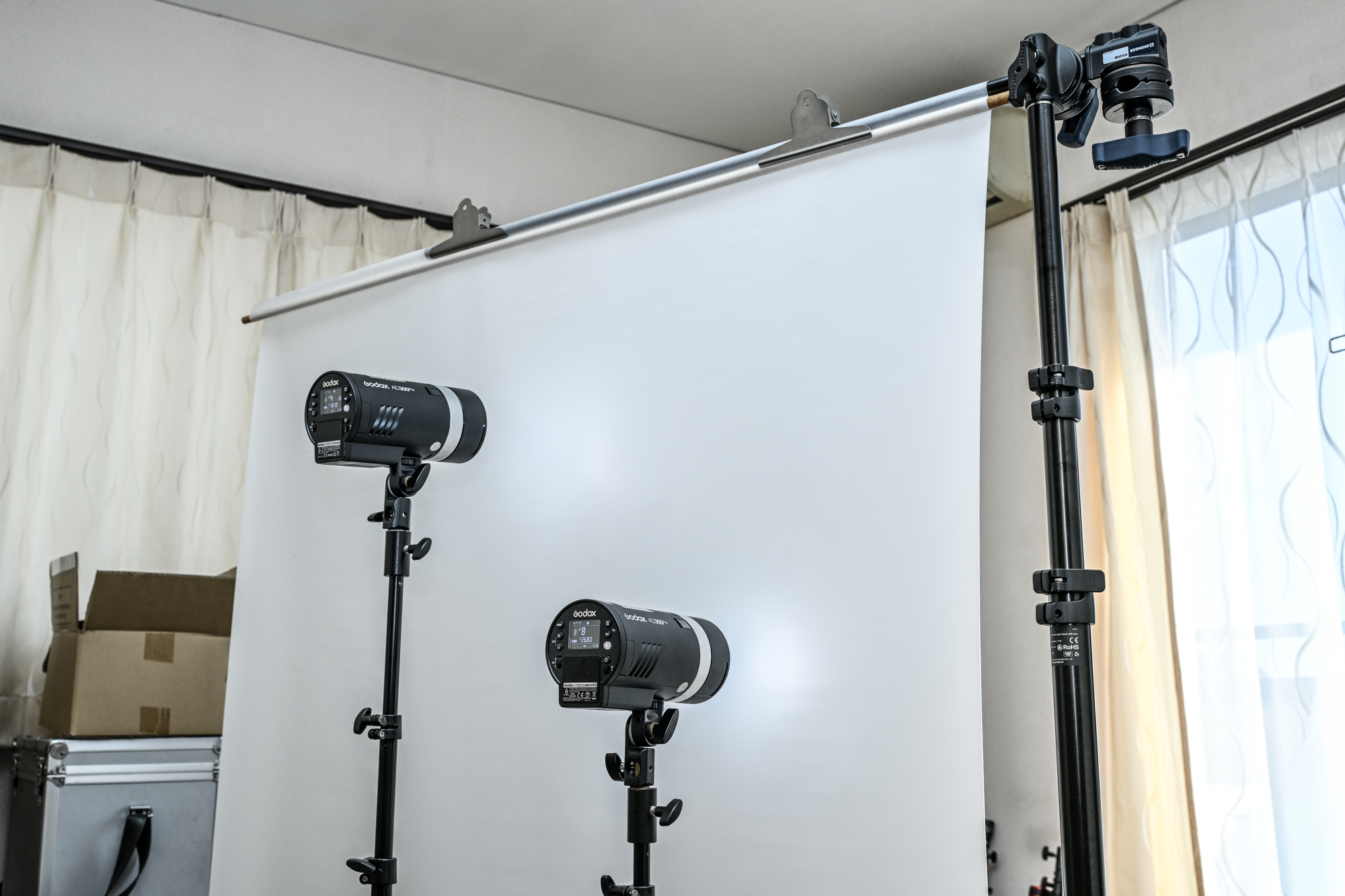 トレペを垂らすのに丁度いいので、トレペ越しのGodox AD300Proを2灯をメイン光にする撮影方法です。